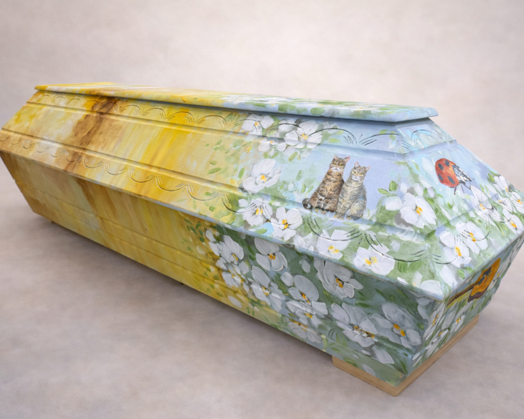 Ručně malovaná rakev vzniká pro citlivé a osobité rozloučení s tím, kdo byl výjimečný.