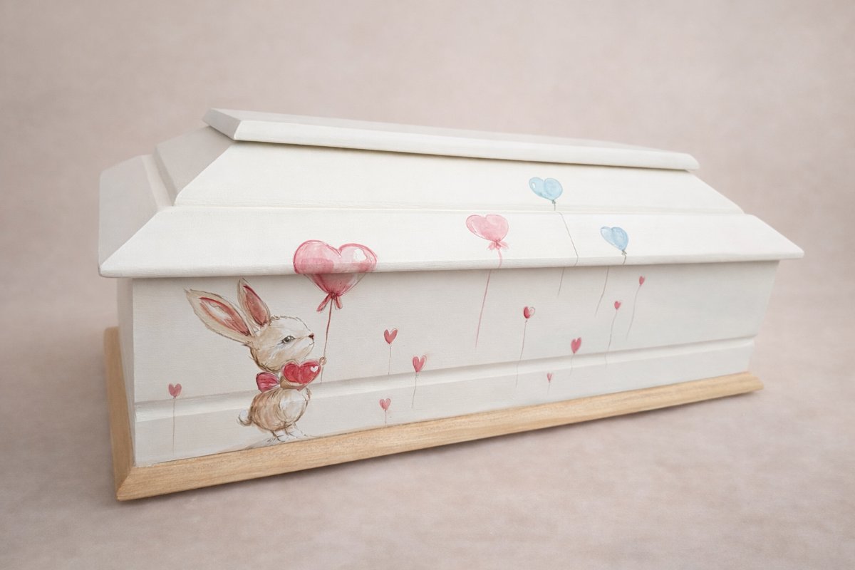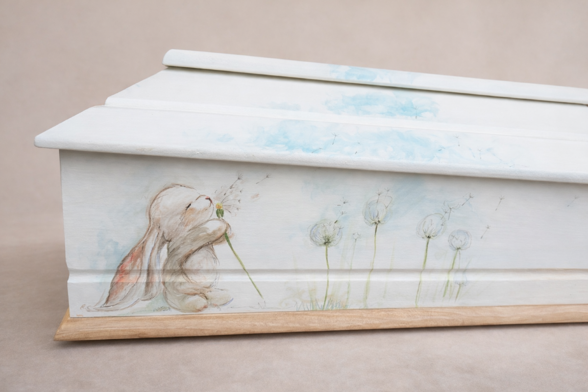 Tato ručně malovaná dětská rakev vznikla jako něžné rozloučení plné světla, čistoty a tichého objetí.
