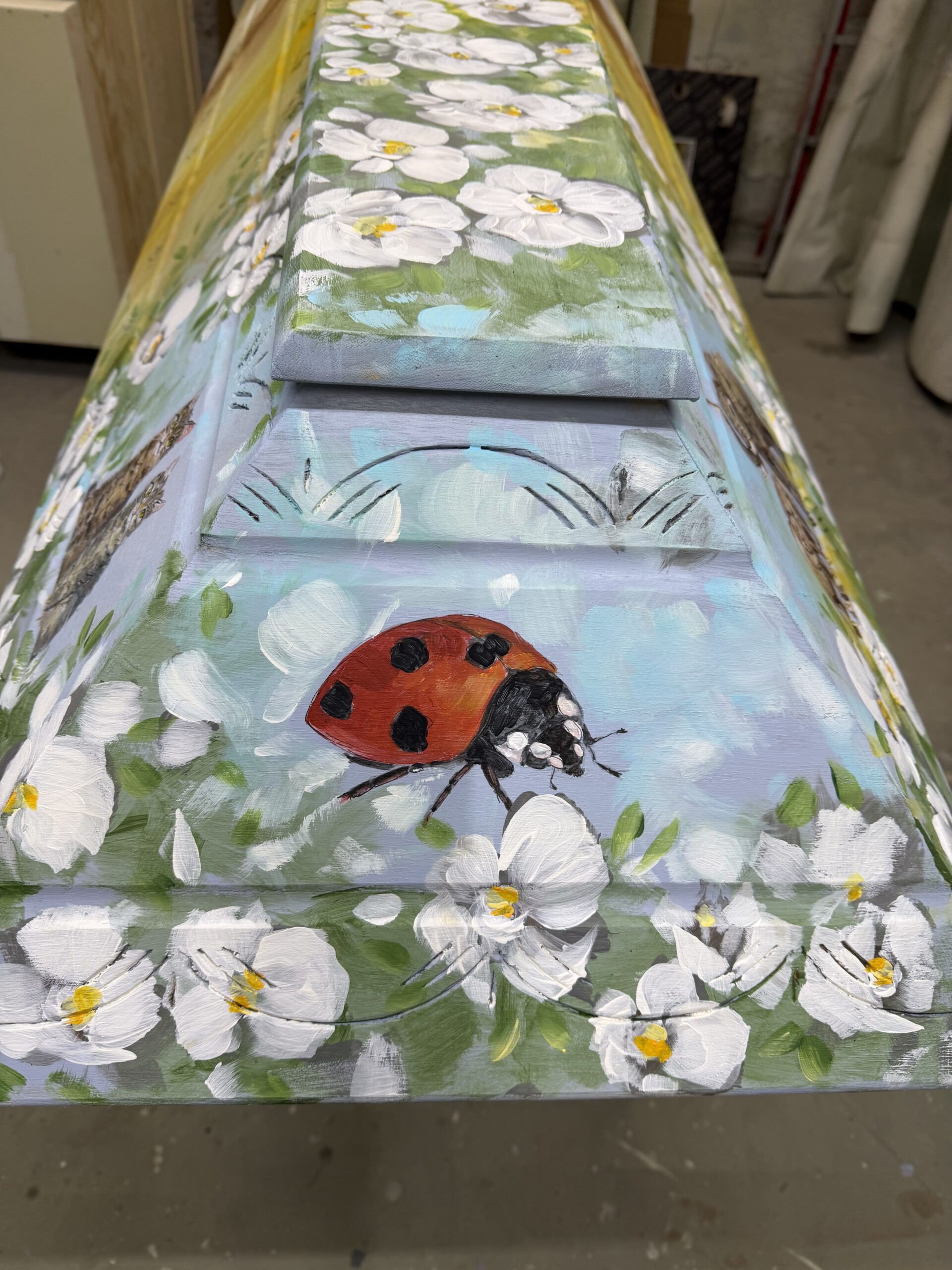 Dle dodaného grafického návrhu a fotografií vznikla tato rakev s hlavním symbolem berušky (velmi osobním symbolickým prvkem pro rodinu).
