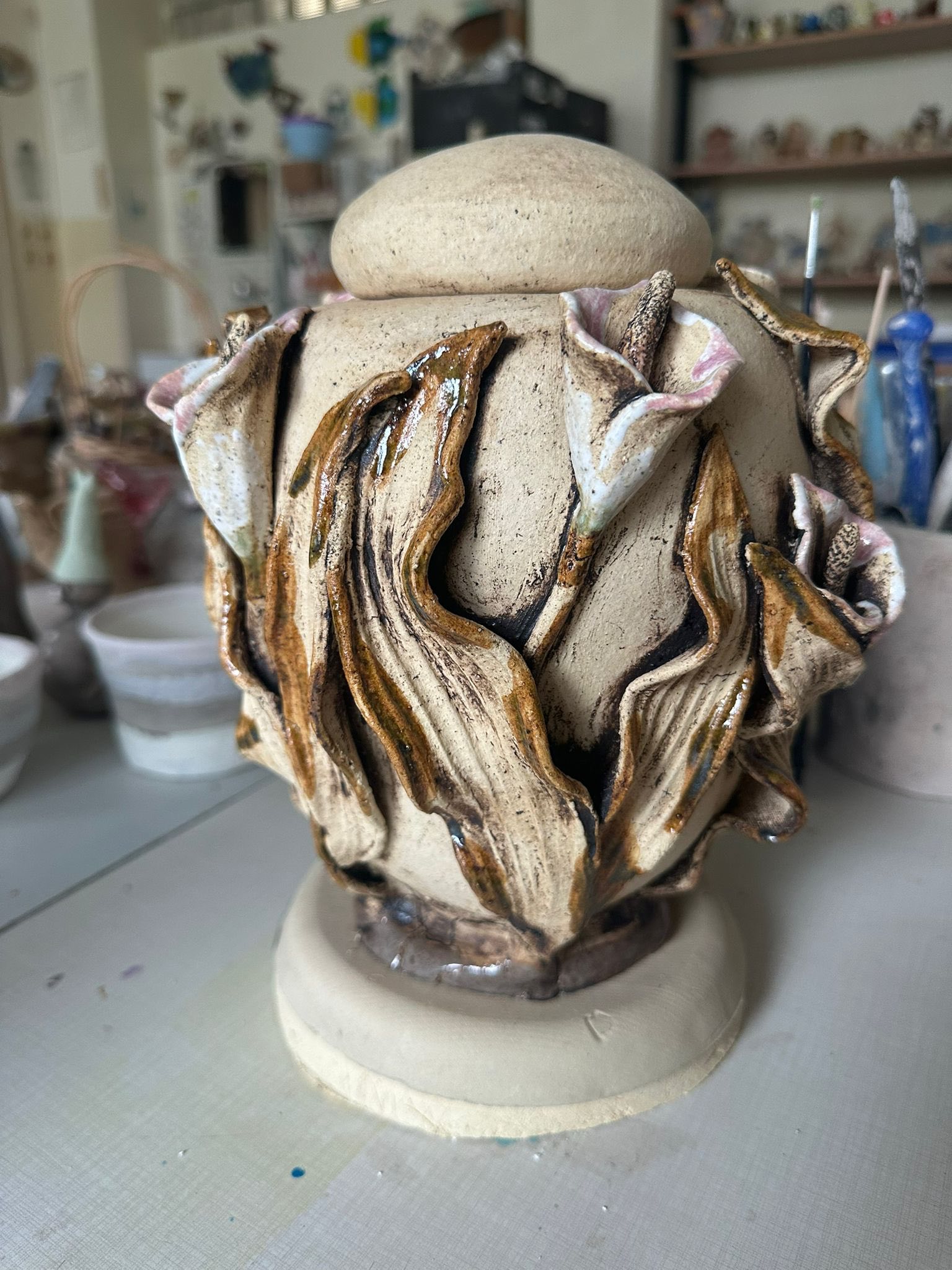 Tato jedinečná keramická urna vznikla jako autorský kus s důrazem na detail, přírodní strukturu a symboliku. Plasticky modelované lilie jemně obepínají celý tvar urny a vytvářejí dojem živé, rostoucí krajiny.